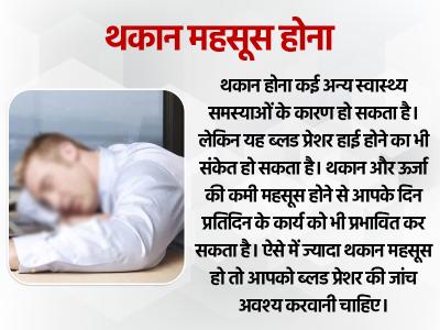 थकान होना कई अन्य स्वास्थ्य समस्याओं के कारण हो सकता है। लेकिन यह ब्लड प्रेशर हाई होने का भी संकेत हो सकता है। थकान और ऊर्जा की कमी महसूस होने से आपके दिन प्रतिदिन के कार्य को भी प्रभावित कर सकता है। ऐसे में ज्यादा थकान महसूस हो तो आपको ब्लड प्रेशर की जांच अवश्य करवानी चाहिए।