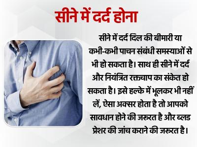 सीने में दर्द दिल की बीमारी या कभी-कभी पाचन संबंधी समस्याओं से भी हो सकता है। साथ ही सीने में दर्द और नियंत्रित रक्तचाप का संकेत हो सकता है। इसे हल्के में भूलकर भी नहीं लें, ऐसा अक्सर होता है तो आपको सावधान होने की जरूरत है और ब्लड प्रेशर की जांच कराने की जरूरत है।