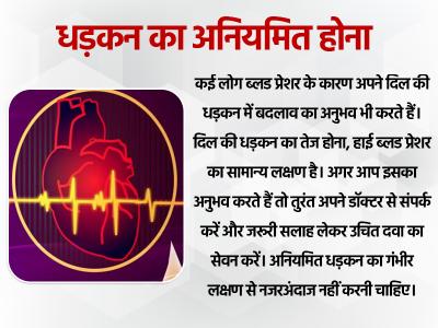 कई लोग ब्लड प्रेशर के कारण अपने दिल की धड़कन में बदलाव का अनुभव भी करते हैं। दिल की धड़कन का तेज होना, हाई ब्लड प्रेशर का सामान्य लक्षण है। अगर आप इसका अनुभव करते हैं तो तुरंत अपने डॉक्टर से संपर्क करें और जरूरी सलाह लेकर उचित दवा का सेवन करें। अनियमित धड़कन का गंभीर लक्षण से नजरअंदाज नहीं करनी चाहिए।