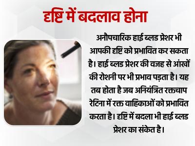 अनौपचारिक हाई ब्लड प्रेशर भी आपकी दृष्टि को प्रभावित कर सकता है। हाई ब्लड प्रेशर की वजह से आंखों की रोशनी पर भी प्रभाव पड़ता है। यह तब होता है जब अनियंत्रित रक्तचाप रेटिना में रक्त वाहिकाओं को प्रभावित करता है। दृष्टि में बदला भी हाई ब्लड प्रेशर का संकेत है।