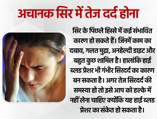 सिर के पिछले हिस्से में कई संभावित कारण हो सकते हैं। जिनमें काम का दबाव, गलत मुद्रा, अनहेल्दी डाइट और बहुत कुछ शामिल है। हालांकि हाई ब्लड प्रेशर भी गंभीर सिरदर्द का कारण बन सकता है। अगर तेज सिरदर्द की समस्या हो तो इसे आप को हल्के में नहीं लेना चाहिए क्योंकि यह हाई ब्लड प्रेशर का संकेत हो सकता है।