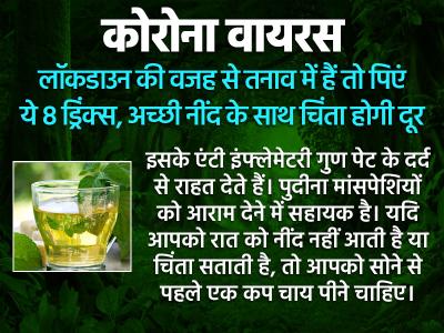 इसके एंटी इंफ्लेमेटरी गुण पेट के दर्द से राहत देते हैं। पुदीना मांसपेशियों को आराम देने में सहायक है। यदि आपको रात को नींद नहीं आती है या चिंता सताती है, तो आपको सोने से पहले एक कप चाय पीने चाहिए।