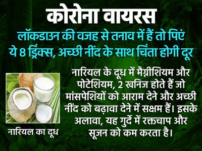 नारियल के दूध में मैग्नीशियम और पोटेशियम, 2 खनिज होते हैं जो मांसपेशियों को आराम देने और अच्छी नींद को बढ़ावा देने में सक्षम हैं। इसके अलावा, यह गुर्दे में रक्तचाप और सूजन को कम करता है। इसकी बड़ी मात्रा में नैचुरल इलेक्ट्रोलाइट्स होते हैं, जो शरीर को संतुलन और आराम देने में सहायक हैं।
