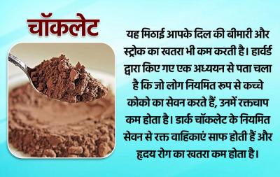 यह मिठाई आपके दिल की बीमारी और स्ट्रोक का खतरा भी कम करती है। हार्वर्ड द्वारा किए गए एक अध्ययन से पता चला है कि जो लोग नियमित रूप से कच्चे कोको का सेवन करते हैं, उनमें रक्तचाप कम होता है। डार्क चॉकलेट के नियमित सेवन से रक्त वाहिकाएं साफ होती हैं और हृदय रोग का खतरा कम होता है।