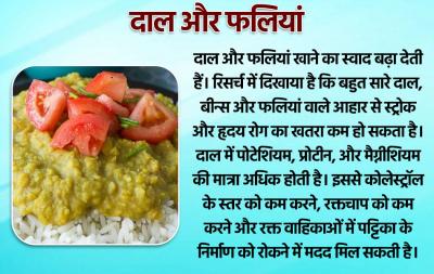 दाल और फलियां खाने का स्वाद बढ़ा देती हैं। रिसर्च में दिखाया है कि बहुत सारे दाल, बीन्स और फलियां वाले आहार से स्ट्रोक और हृदय रोग का खतरा कम हो सकता है। दाल में पोटेशियम, प्रोटीन, और मैग्नीशियम की मात्रा अधिक होती है। इससे कोलेस्ट्रॉल के स्तर को कम करने, रक्तचाप को कम करने और रक्त वाहिकाओं में पट्टिका के निर्माण को रोकने में मदद मिल सकती है।