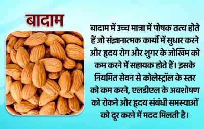 बादाम में उच्च मात्रा में पोषक तत्व होते हैं जो संज्ञानात्मक कार्यों में सुधार करने और हृदय रोग और शुगर के जोखिम को कम करने में सहायक होते हैं। इसके नियमित सेवन से कोलेस्ट्रॉल के स्तर को कम करने, एलडीएल के अवशोषण को रोकने और हृदय संबंधी समस्याओं को दूर करने में मदद मिलती है।