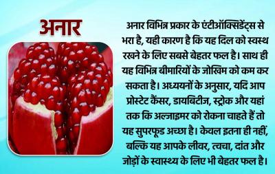 अनार विभिन्न प्रकार के एंटीऑक्सिडेंट्स से भरा है, यही कारण है कि यह दिल को स्वस्थ रखने के लिए सबसे बेहतर फल है। साथ ही यह विभिन्न बीमारियों के जोखिम को कम कर सकता है। अध्ययनों के अनुसार, यदि आप प्रोस्टेट कैंसर, डायबिटीज, स्ट्रोक और यहां तक कि अल्जाइमर को रोकना चाहते हैं तो यह सुपरफूड अच्छा है। केवल इतना ही नहीं, बल्कि यह आपके लीवर, त्वचा, दांत और जोड़ों के स्वास्थ्य के लिए भी बेहतर फल है।