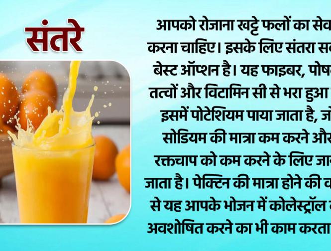 आपको रोजाना खट्टे फलों का सेवन करना चाहिए। इसके लिए संतरा सबसे बेस्ट ऑप्शन है। यह फाइबर, पोषक तत्वों और विटामिन सी से भरा हुआ है। इसमें पोटेशियम पाया जाता है, जो सोडियम की मात्रा कम करने और रक्तचाप को कम करने के लिए जाना जाता है। पेक्टिन की मात्रा होने की वजह से यह आपके भोजन में कोलेस्ट्रॉल को अवशोषित करने का भी काम करता है।