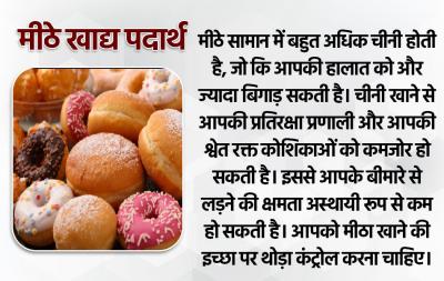 मीठे सामान में बहुत अधिक चीनी होती है, जो कि आपकी हालात को और ज्यादा बिगाड़ सकती है। चीनी खाने से आपकी प्रतिरक्षा प्रणाली और आपकी श्वेत रक्त कोशिकाओं को कमजोर हो सकती है। इससे आपके बीमारे से लड़ने की क्षमता अस्थायी रूप से कम हो सकती है। आपको मीठा खाने की इच्छा पर थोड़ा कंट्रोल करना चाहिए।