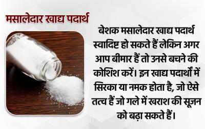 बेशक मसालेदार खाद्य पदार्थ स्वादिष्ट हो सकते हैं लेकिन अगर आप बीमार हैं तो उनसे बचने की कोशिश करें। इन खाद्य पदार्थों में सिरका या नमक होता है, जो ऐसे तत्व हैं जो गले में खराश की सूजन को बढ़ा सकते हैं।