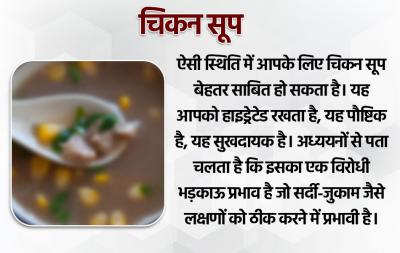 ऐसी स्थिति में आपके लिए चिकन सूप बेहतर साबित हो सकता है। यह आपको हाइड्रेटेड रखता है, यह पौष्टिक है, यह सुखदायक है। अध्ययनों से पता चलता है कि इसका एक विरोधी भड़काऊ प्रभाव है जो सर्दी-जुकाम जैसे लक्षणों को ठीक करने में प्रभावी है।