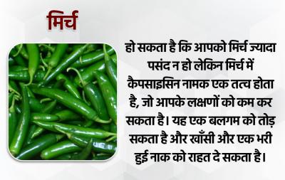 हो सकता है कि आपको मिर्च ज्यादा पसंद न हो लेकिन मिर्च में कैपसाइसिन नामक एक तत्व होता है, जो आपके लक्षणों को कम कर सकता है। यह एक बलगम को तोड़ सकता है और खाँसी और एक भरी हुई नाक को राहत दे सकता है।