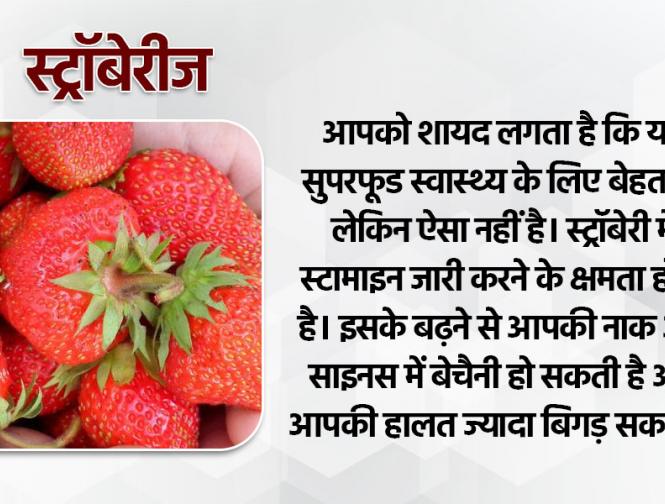 आपको शायद लगता है कि यह सुपरफूड स्वास्थ्य के लिए बेहतर है लेकिन ऐसा नहीं है। स्ट्रॉबेरी में स्टामाइन जारी करने के क्षमता होती है। इसके बढ़ने से आपकी नाक और साइनस में बेचैनी हो सकती है और आपकी हालत ज्यादा बिगड़ सकती है।