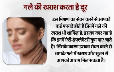 इस मिश्रण का सेवन करने से आपको कई फायदे होते हैं जिनमें गले की खराश भी शामिल है. इसका कार यह है कि इनमें एंटी-इंफ्लेमेटरी गुण पाए जाते है। जिसके कारण इसका सेवन करने से आपके गले में खराश और सूजन से आपको आराम मिल सकता है।