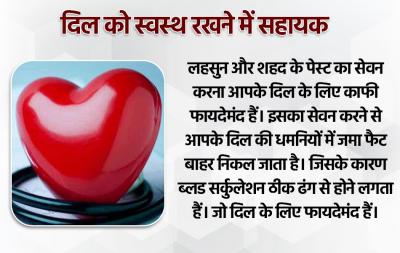 लहसुन और शहद के पेस्ट का सेवन करना आपके दिल के लिए काफी फायदेमंद हैं। इसका सेवन करने से आपके दिल की धमनियों में जमा फैट बाहर निकल जाता है। जिसके कारण ब्लड सर्कुलेशन ठीक ढंग से होने लगता हैं। जो दिल के लिए फायदेमंद हैं।