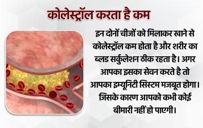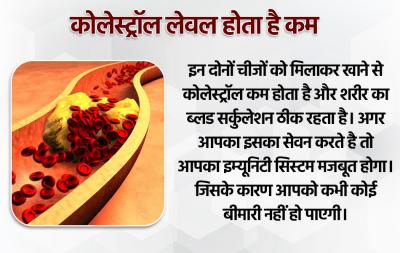 इन दोनों चीजों को मिलाकर खाने से कोलेस्ट्रॉल कम होता है और शरीर का ब्लड सर्कुलेशन ठीक रहता है। अगर आपका इसका सेवन करते है तो आपका इम्यूनिटी सिस्टम मजबूत होगा। जिसके कारण आपको कभी कोई बीमारी नहीं हो पाएगी।