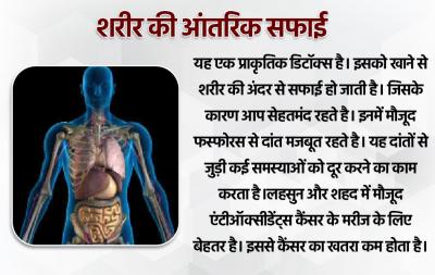 यह एक प्राकृतिक डिटॉक्स है। इसको खाने से शरीर की अंदर से सफाई हो जाती है। जिसके कारण आप सेहतमंद रहते है। इनमें मौजूद फस्फोरस से दांत मजबूत रहते है। यह दांतों से जुड़ी कई समस्याओं को दूर करने का काम करता है।लहसुन और शहद में मौजूद एंटीऑक्सीडेंट्स कैंसर के मरीज के लिए बेहतर है। इससे कैंसर का खतरा कम होता है।