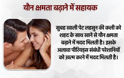 सुबह खाली पेट लहसुन की कली को शहद के साथ खाने से यौन क्षमता बढ़ाने में मदद मिलती है। इसके अलावा पीरियड्स संबंधी परेशानियों को ख़त्म करने में मदद मिलती है।