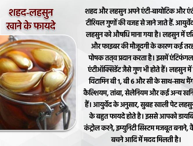 शहद और लहसुन अपने एंटी-बायोटिक और एंटी-बैक्टीरियल गुणों की वजह से जाने जाते हैं. आयुर्वेद में तो लहसुन को औषधि माना गया है। लहसुन में एलिसिन और फाइबर की मौजूदगी के कारण कई तरह के पोषक तत्व प्रदान करता है। इसमें एंटिफंगल और एंटीऑक्सिडेंट जैसे गुण भी होते हैं।