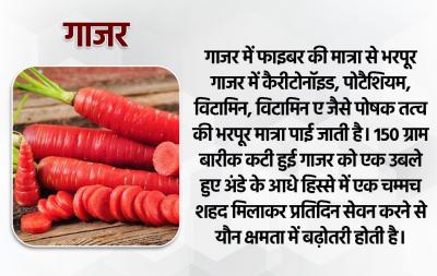 गाजर में फाइबर की मात्रा से भरपूर गाजर में कैरीटोनॉइड, पोटैशियम, विटामिन, विटामिन ए जैसे पोषक तत्व की भरपूर मात्रा पाई जाती है। 150 ग्राम बारीक कटी हुई गाजर को एक उबले हुए अंडे के आधे हिस्से में एक चम्मच शहद मिलाकर प्रतिदिन सेवन करने से यौन क्षमता में बढ़ोतरी होती है।