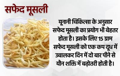 यूनानी चिकित्सा के अनुसार सफेद मूसली का प्रयोग भी बेहतर होता है। इसके लिए 15 ग्राम सफेद मूसली को एक कप दूध में उबालकर दिन में दो बार पीने से यौन शक्ति में बढ़ोतरी होती है।