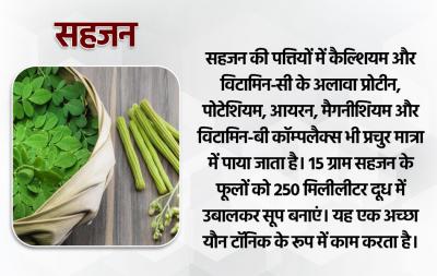 सहजन की पत्तियों में कैल्शियम और विटामिन-सी के अलावा प्रोटीन, पोटेशियम, आयरन, मैगनीशियम और विटामिन-बी कॉम्पलैक्स भी प्रचुर मात्रा में पाया जाता है। 15 ग्राम सहजन के फूलों को 250 मिलीलीटर दूध में उबालकर सूप बनाएं। यह एक अच्छा यौन टॉनिक के रूप में काम करता है।
