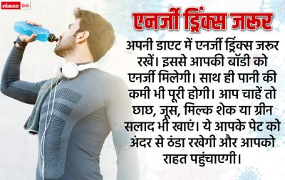 अपनी डाएट में एनर्जी ड्रिंक्स जरूर रखें। इससे आपकी बॉडी को एनर्जी मिलेगी। साथ ही पानी की कमी भी पूरी होगी। आप चाहें तो छाछ, जूस, मिल्क शेक या ग्रीन सलाद भी खाएं। ये आपके पेट को अंदर से ठंडा रखेगी और आपको राहत पहुंचाएगी।