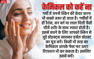 गर्मी में अपनी स्किन की केयर करना भी सबसे जरूर हो जाता है। गर्मीयों में ही रैशेस, सन बर्न या लाल चित्ती जैसी चीजें शरीर के साथ ज्यादा होती है। इससे बचने के लिए आपको स्किन से जुड़े प्रोडक्ट्स खासकर हर्बल प्रोडक्ट का यूज करें। किसी भी तरह का केमिकल आपके फेस फर उल्टा रिएक्शन भी कर सकता है। इसलिए इससे बचें।