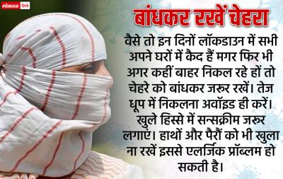 वैसे तो इन दिनों लॉकडाउन में सभी अपने घरों में कैद हैं मगर फिर भी अगर कहीं बाहर निकल रहे हों तो चेहरे को बांधकर जरूर रखें। तेज धूप में निकलना अवॉइड ही करें। खुले हिस्से में सन्सक्रीम जरूर लगाएं। हाथों और पैरौं को भी खुला ना रखें इससे एलर्जिक प्रॉब्लम हो सकती है।