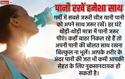 गर्मी में सबसे जरूरी चीज यानी पानी को अपने साथ जरूर रखें। हर घंटे थोड़ी-थोड़ी मात्रा में पानी जरूर पीएं। कहीं बाहर निकल रहे हैं तो अपनी पानी की बोलत साथ रखना बिल्कुल ना भूलें। आपके शरीर के अंदर पानी की जरा भी कमी आपकी सेहत के लिए नुकसानदायक हो सकती है।