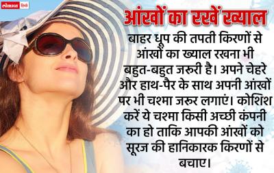 बाहर धूप की तपती किरणों से आंखों का ख्याल रखना भी बहुत-बहुत जरूरी है। अपने चेहरे और हाथ-पैर के साथ अपनी आंखों पर भी चश्मा जरूर लगाएं। कोशिश करें ये चश्मा किसी अच्छी कंपनी का हो ताकि आपकी आंखों को सूरज की हानिकारक किरणों से बचाए।