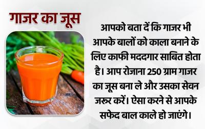 आपको बता दें कि गाजर भी आपके बालों को काला बनाने के लिए काफी मददगार साबित होता है। आप रोजाना 250 ग्राम गाजर का जूस बना ले और उसका सेवन जरूर करें। ऐसा करने से आपके सफेद बाल काले हो जाएंगे।