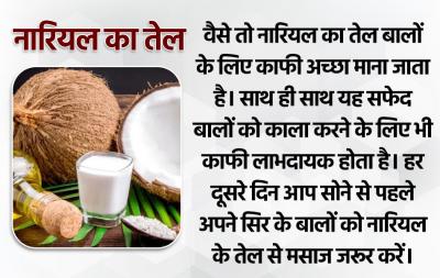 वैसे तो नारियल का तेल बालों के लिए काफी अच्छा माना जाता है। साथ ही साथ यह सफेद बालों को काला करने के लिए भी काफी लाभदायक होता है। हर दूसरे दिन आप सोने से पहले अपने सिर के बालों को नारियल के तेल से मसाज जरूर करें।