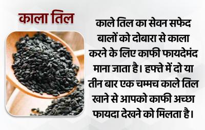 काले तिल का सेवन सफेद बालों को दोबारा से काला करने के लिए काफी फायदेमंद माना जाता है। हफ्ते में दो या तीन बार एक चम्मच काले तिल खाने से आपको काफी अच्छा फायदा देखने को मिलता है।