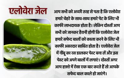 आप सभी को अच्छी तरह से पता है कि एलोवेरा हमारे चेहरे के साथ-साथ हमारे पेट के लिए भी काफी लाभदायक होता है। लेकिन दोस्तों आप सभी को जानकर हैरानी होगी कि एलोवेरा जेल हमारे सफेद बालों को काला करने के लिए भी काफी असरदार साबित होता है। एलोवेरा जेल में नींबू का रस डालकर पेस्ट बना लें और इस पेस्ट को अपने बालों में लगाएं। दोस्तों अगर आप हफ़्ते में ऐसा एक बार करते हैं तो आपके सफेद बाल काले हो जाएंगे।