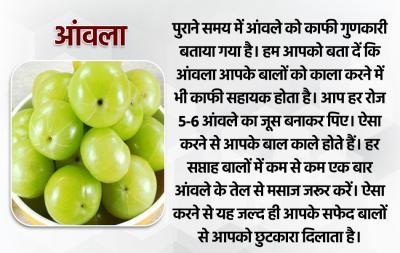 पुराने समय में आंवले को काफी गुणकारी बताया गया है। हम आपको बता दें कि आंवला आपके बालों को काला करने में भी काफी सहायक होता है। आप हर रोज 5-6 आंवले का जूस बनाकर पिए। ऐसा करने से आपके बाल काले होते हैं। हर सप्ताह बालों में कम से कम एक बार आंवले के तेल से मसाज जरूर करें। ऐसा करने से यह जल्द ही आपके सफेद बालों से आपको छुटकारा दिलाता है।