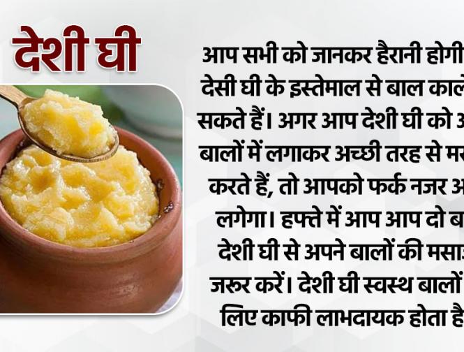 आप सभी को जानकर हैरानी होगी कि देसी घी के इस्तेमाल से बाल काले हो सकते हैं। अगर आप देशी घी को अपने बालों में लगाकर अच्छी तरह से मसाज करते हैं, तो आपको फर्क नजर आने लगेगा। हफ्ते में आप आप दो बार देशी घी से अपने बालों की मसाज जरूर करें। देशी घी स्वस्थ बालों के लिए काफी लाभदायक होता है।