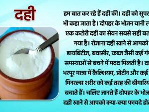 1 / 8हम बात कर रहे हैं दही की। दही को सूपर फूड भी कहा जाता है। दोपहर के भोजन यानी लंच में एक कटोरी दही का सेवन सबसे सही बताया गया है। रोजाना दही खाने से आपको डायबिटीज, बवासीर, कब्ज जैसी कई गंभीर समस्याओं से बचने में मदद मिलती है। दही में भरपूर मात्रा में कैल्शियम, प्रोटीन और कई दूसरे मिनरल्स शरीर को कई तरह की बीमारियों से बचाते हैं। चलिए जानते हैं दोपहर के भोजन में दही खाने से आपको क्या-क्या फायदे होते हैं। 2 / 8लंच में एक कटोरा दही खाने से आपको वजन कम करने में मदद मिल सकती है। दही के सेवन से शरीर को उचित पोषक तत्व मिल जाते हैं और बार-बार भूख नहीं लगती। दही में मौजूद कैल्शियम और प्रोटीन भी शरीर के फैट को कम करने में सहायक हैं।3 / 8जंक फूड खाने से आपके दिल पर काफी असर पड़ता है। हर रोज खाने में दही को शामिल करने से आपका दिल मजबूत रहेगा और कई बीमारियों से बचे रहेंगे। दही शरीर में कोलेस्ट्रोल की मात्रा को भी कम करती है। 4 / 8दोपहर के खाने के साथ एक कटोरी दही को अपने आहार में शामिल करने से शरीर की रोग प्रतिरोधक क्षमता बढ़ती है, जिससे शरीर का कई रोगों से बचाव होता है।5 / 8विटामिन ए, डी, और बी-12 से युक्त एक कटोरी दही में 100 ग्राम फैट और 98 ग्राम कैलोरी है। दही में भरपूर मात्रा में कैल्शियम होता है, जो हडि्डयों को मजबूत करता है।6 / 8दही शरीर में से अतिरिक्त पोटैशियम को बाहर निकाल देता है, जिससे उच्च रक्तचाप जैसी समस्या से भी राहत मिलती है। दही में मौजूद प्रोबायोटिक कोलेस्ट्रॉल को कम रखने में मदद करते हैं, इसके अलावा दही हृदय रोगों के लिए भी लाभदायक है।7 / 8दही में विभिन्न तरह के पोषक तत्व पाए जाते हैं। सिरदर्द से राहत पाने के लिए आपको रोजाना एक कटोरी दही खानी चाहिए। 8 / 8दही में भुना हुआ पिसा जीरा, नमक और कालीमिर्च डालकर रोजाना खाने से अपच की समस्या से राहत मिलती है और भोजन जल्दी पच जाता है। बवासीर के रोगियों को भी दोपहर के भोजन के साथ दही या छाछ में अजवायन डाल कर पीने की सलाह दी जाती है। अगर आपको भी यह समस्या है तो अपने दोपहर के भोजन के साथ दही जरूर खायें।
