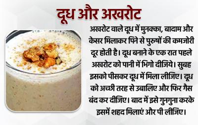 अखरोट वाले दूध में मुनक्का, बादाम और केसर मिलाकर पिने से पुरुषों की कमजोरी दूर होती है। दूध बनाने के एक रात पहले अखरोट को पानी में भिगो दीजिये। सुबह इसको पीसकर दूध में मिला लीजिए। दूध को अच्छी तरह से उबालिए और फिर गैस बंद कर दीजिए। बाद में इसे गुनगुना करके इसमें शहद मिलाएं और पी लीजिए।