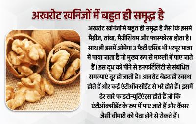 अखरोट खनिजों में बहुत ही समृद्ध है जैसे कि इसमें मैग्नीज, तांबा, मैग्नीशियम और फास्फोरस होता है। साथ ही इसमें ओमेगा 3 फैटी एसिड भी भरपूर मात्रा में पाया जाता है जो मुख्य रूप से मछली में पाए जाते हैं। इस दूध को पीने से इनफर्टिलिटी से संबंधित समस्याएं दूर हो जाती है। अखरोट बेहद ही स्वस्थ होते हैं और कई एंटीऑक्सीडेंट से भरे होते हैं। इसमें ढेर सारे फाइटोन्यूट्रिएंट्स होते हैं जो कि एंटीऑक्सीडेंट के रूप में पाए जाते हैं और कैंसर जैसी बीमारी को पैदा होने से रोकते हैं।