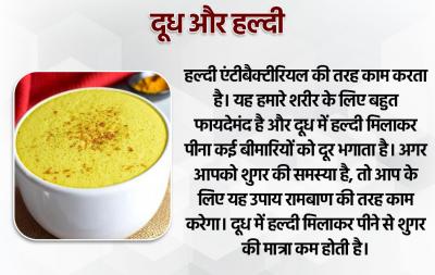 हल्दी एंटीबैक्टीरियल की तरह काम करता है। यह हमारे शरीर के लिए बहुत फायदेमंद है और दूध में हल्दी मिलाकर पीना कई बीमारियों को दूर भगाता है। अगर आपको शुगर की समस्या है, तो आप के लिए यह उपाय रामबाण की तरह काम करेगा। दूध में हल्दी मिलाकर पीने से शुगर की मात्रा कम होती है।