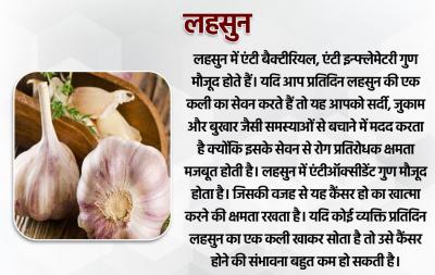 लहसुन में एंटी बैक्टीरियल, एंटी इन्फ्लेमेटरी गुण मौजूद होते हैं। यदि आप प्रतिदिन लहसुन की एक कली का सेवन करते हैं तो यह आपको सर्दी, जुकाम और बुखार जैसी समस्याओं से बचाने में मदद करता है क्योंकि इसके सेवन से रोग प्रतिरोधक क्षमता मजबूत होती है।