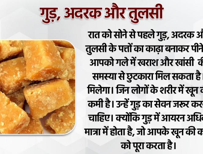 रात को सोने से पहले गुड़, अदरक और तुलसी के पत्तों का काढ़ा बनाकर पीने से आपको गले में खराश और खांसी की समस्या से छुटकारा मिल सकता है। मिलेगा। जिन लोगों के शरीर में खून की कमी है। उन्हें गुड़ का सेवन जरूर करना चाहिए। क्योंकि गुड़ में आयरन अधिक मात्रा में होता है, जो आपके खून की कमी को पूरा करता है।