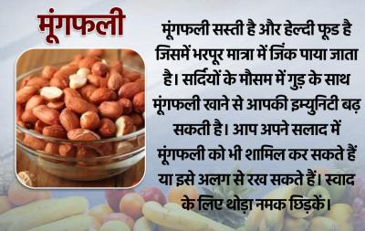 मूंगफली सस्ती है और हेल्दी फूड है जिसमें भरपूर मात्रा में जिंक पाया जाता है। सर्दियों के मौसम में गुड़ के साथ मूंगफली खाने से आपकी इम्युनिटी बढ़ सकती है। आप अपने सलाद में मूंगफली को भी शामिल कर सकते हैं या इसे अलग से रख सकते हैं। स्वाद के लिए थोड़ा नमक छिड़कें।