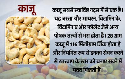 काजू सबसे स्वादिष्ट नट्स में से एक है। यह जस्ता और आयरन, विटामिन के, विटामिन ए और फोलेट जैसे अन्य पोषक तत्वों से भरा होता है। 28 ग्राम काजू में 1।6 मिलीग्राम जिंक होता है और नियमित रूप से इनका सेवन करने से रक्तचाप के स्तर को बनाए रखने में मदद मिलती है।