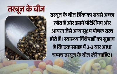तरबूज के बीज जिंक का सबसे अच्छा स्रोत हैं और इसमें पोटेशियम और आयरन जैसे अन्य सूक्ष्म पोषक तत्व होते हैं। स्वास्थ्य विशेषज्ञों का सुझाव है कि एक सप्ताह में 2-3 बार आधा चम्मच तरबूज के बीज लेने चाहिए।