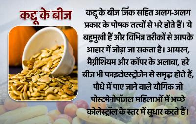 कद्दू के बीज जिंक सहित अलग-अलग प्रकार के पोषक तत्वों से भरे होते हैं। ये बहुमुखी हैं और विभिन्न तरीकों से आपके आहार में जोड़ा जा सकता है। आयरन, मैग्नीशियम और कॉपर के अलावा, हरे बीज भी फाइटोएस्ट्रोजेन से समृद्ध होते हैं, पौधे में पाए जाने वाले यौगिक जो पोस्टमेनोपॉजल महिलाओं में अच्छे कोलेस्ट्रॉल के स्तर में सुधार करते हैं।