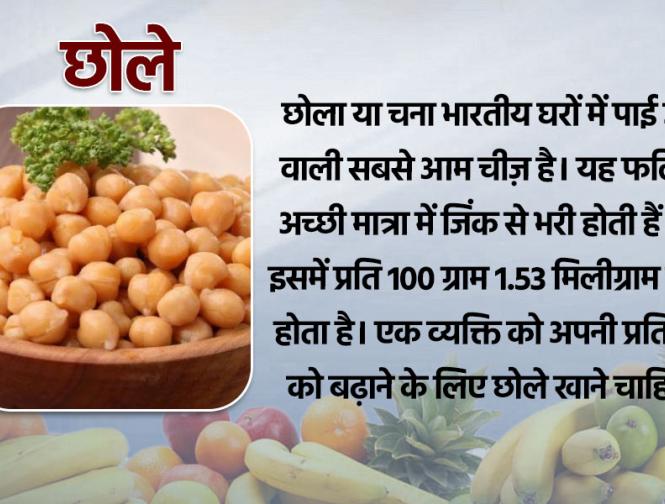 छोला या चना भारतीय घरों में पाई जाने वाली सबसे आम चीज़ है। यह फलियां अच्छी मात्रा में जिंक से भरी होती हैं और इसमें प्रति 100 ग्राम 1.53 मिलीग्राम जिंक होता है। एक व्यक्ति को अपनी प्रतिरक्षा को बढ़ाने के लिए छोले खाने चाहिए।