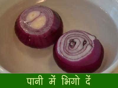 प्याज को काटने से पहले उसे छीलकर पानी में भिगो दें। इसकी वजह से प्याज से निकलने वाली गैस बैठ जाती है और प्याज काटते समय आपकी आंखों में आंसूं भी नहीं आएंगे। प्याज को काटने से आधा घंटे पहले आप उसे पानी में डाल दें।
