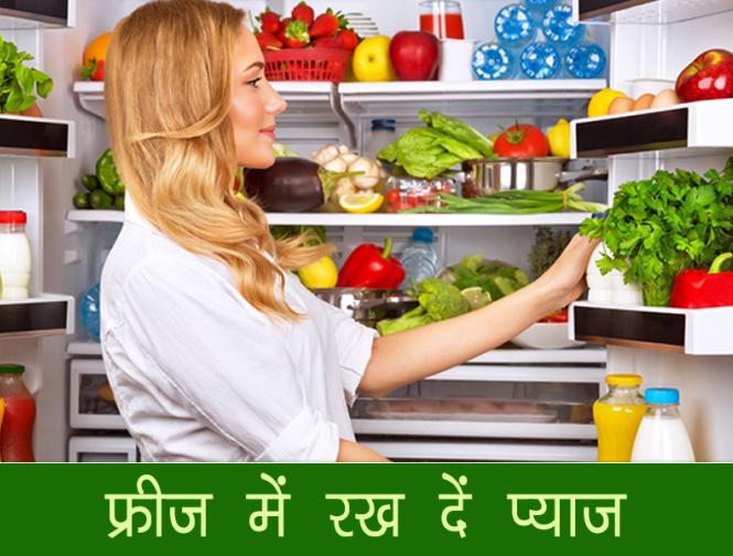 जब भी प्याज काटना हो उसके एक या दो घंटे पहले प्याज को फ्रिज में रख दें। ठंडा हो जाने के बाद इसे काटने से प्याज से निकलने वाली सल्फोऑक्साइड गैस का असर कुछ कम हो जाता है।
